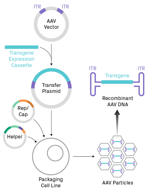 Production of AAV particles for therapeutic gene delivery. A gene of interest is cloned into an AAV vector to create a transfer plasmid, which is then introduced into a eukaryotic cell line. Generating functional viral particles requires co-transfection with several viral genes, supplied by packaging plasmids (i.e. Rep/Cap and helper plasmids). Recombinant single-stranded DNA, containing the transgene flanked by inverted terminal repeat (ITR) sequences, is packaged into capsids. The ITRs form very stable hairpins, which are problematic for amplification and sequencing of AAV plasmids during the early steps of the workflow.